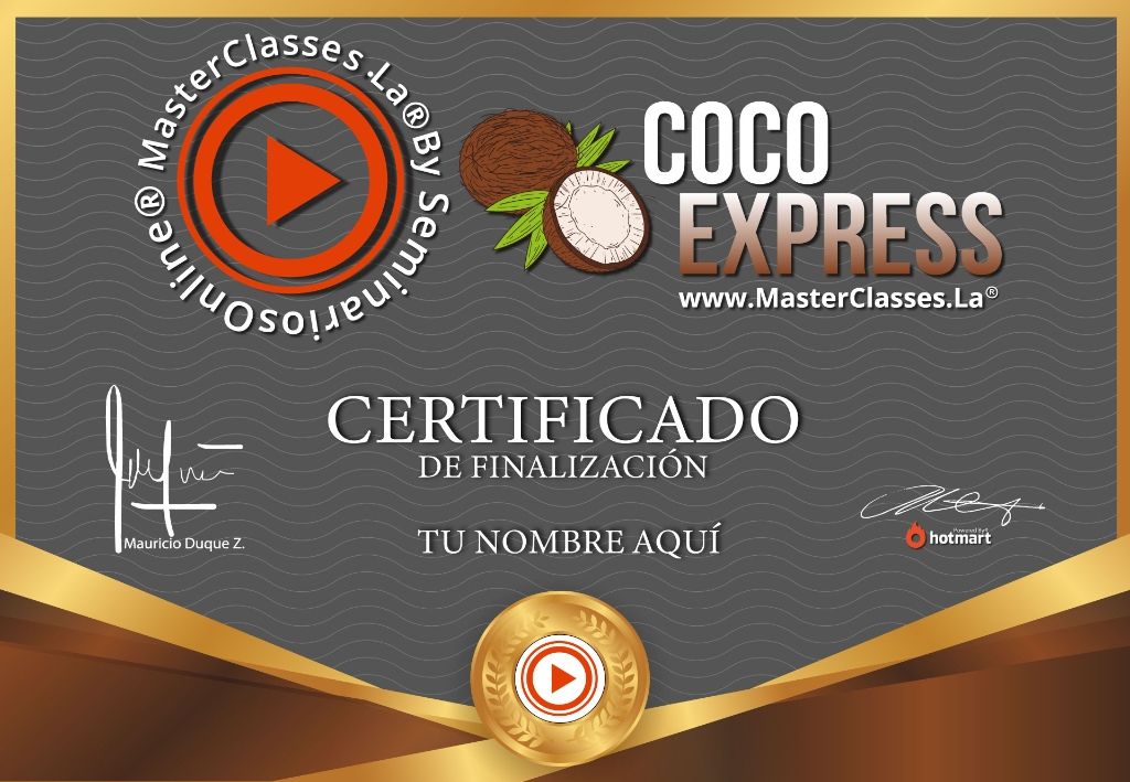 ¡Descubre el MasterClass COCO EXPRESS y aprende a hacer deliciosos jugos y dulces de coco! Este curso te enseñará paso a paso cómo preparar jugos espumosos, cremosos helados y dulces irresistibles. Además, aprenderás cómo convertir esta habilidad en un negocio rentable a través de las redes sociales. Obtén tu certificado avalado por Hotmart y Seminarios Online. No te pierdas la oportunidad de alimentarte de manera saludable y emprender un negocio exitoso. ¡Inscríbete ahora!