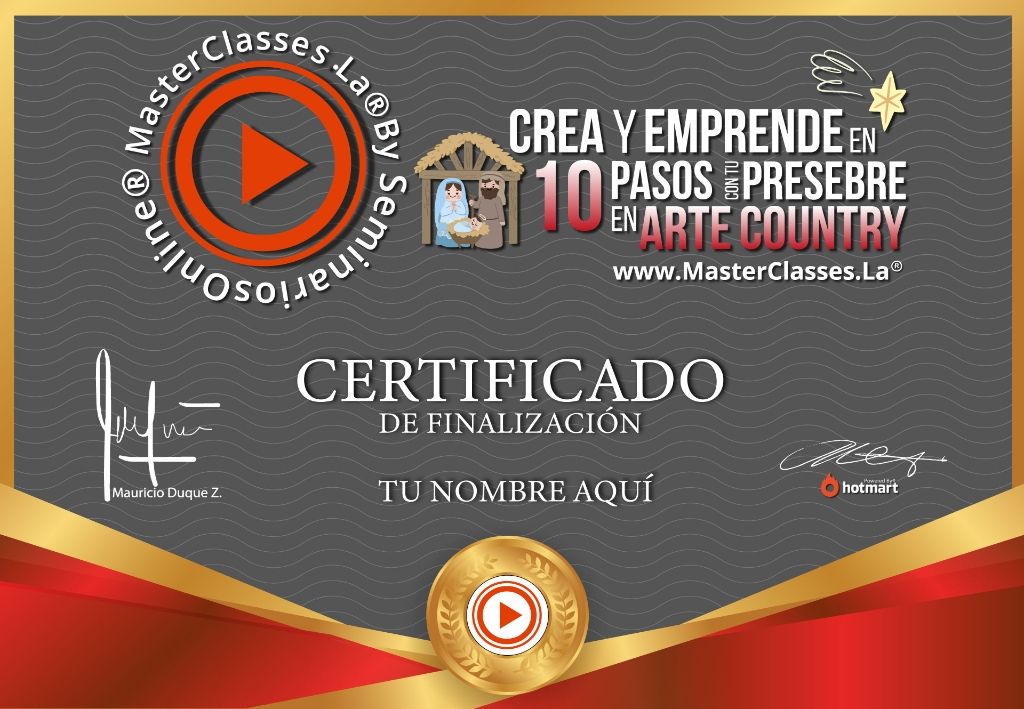 Aprende a crear pesebres espectaculares y genera ingresos en época navideña con el masterclass «CREA Y EMPRENDE EN 10 PASOS CON TU PESEBRE EN ARTE COUNTRY». Con este curso, desarrollado por EDEN CASTELLANOS, diseñadora y manualista con 20 años de experiencia, aprenderás técnicas de moldería, costura, decoración y más para crear tus propios pesebres y venderlos a un excelente precio. Obtén certificado avalado por Hotmart y Seminarios Online. ¡No te quedes atrás en esta tendencia y aprovecha esta oportunidad para generar ingresos económicos!